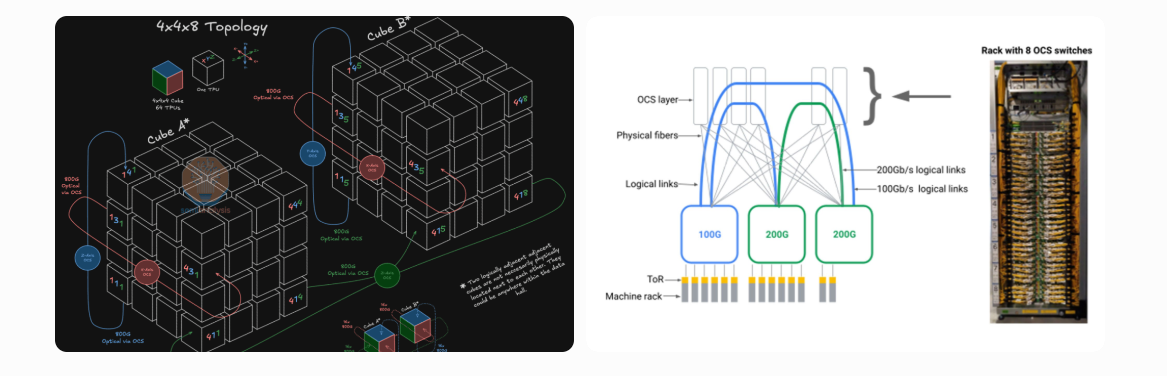 Example of Google AI Data Center OCS Deployment (TPU topology and rack photos):